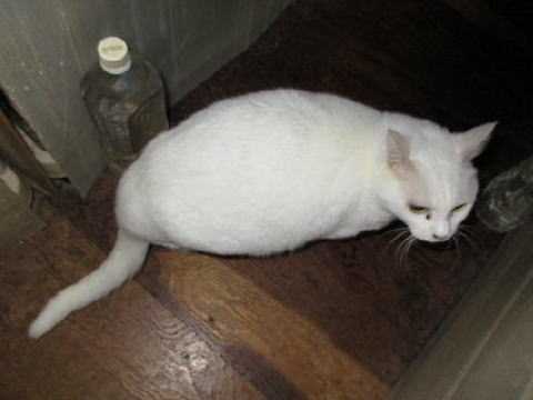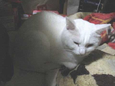 スチール棚下の箱の中のユキ♀は、カメラを見てるから、目が光ってる~