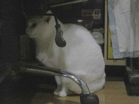 父ちゃんの椅子の下に隠れてるホワイト♂
