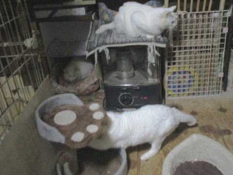 二段BOX下の猫ベットにアキ♀ストーブの上の将♂玄関の方を見てる