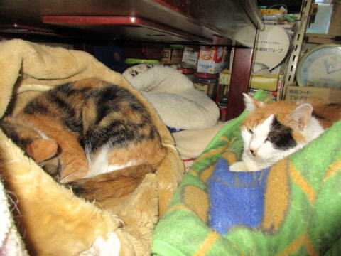 コタツ下の猫ベットにふみ♀父ちゃんの足元の毛布の上にミコ♀