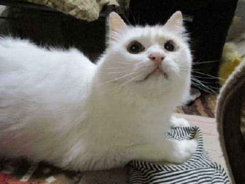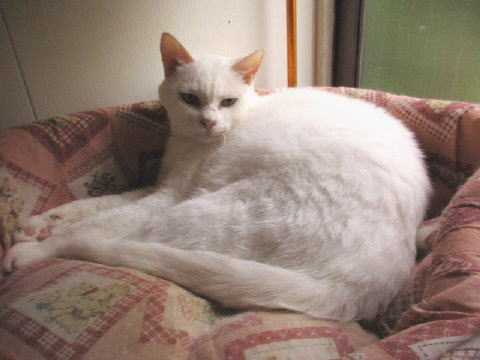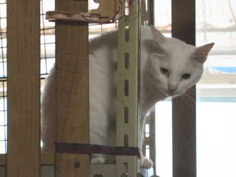 勝手口パイプ棚上のホワイト♂は、寛いでる