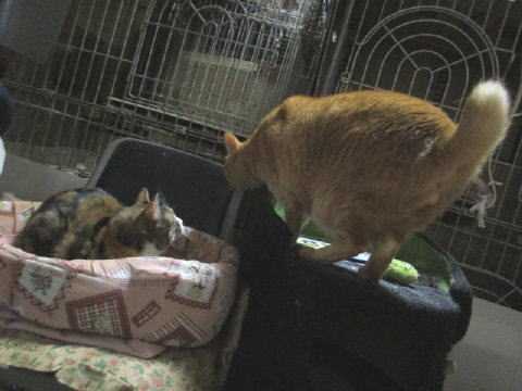 スチール棚上に将♂タワーてっぺんでアキ♀