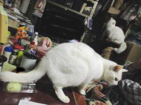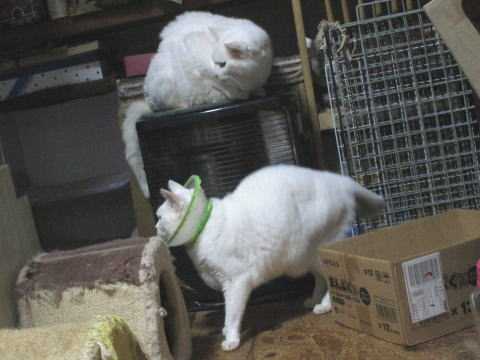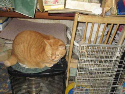 使ってないストーブ上にコチャ♂奥の白い篭の中にホワイト♂