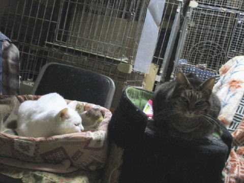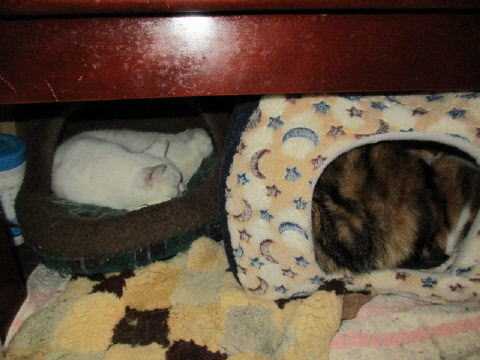 コタツ下の猫ベットにタスキ♀横の猫ハウスベットにふみ♀