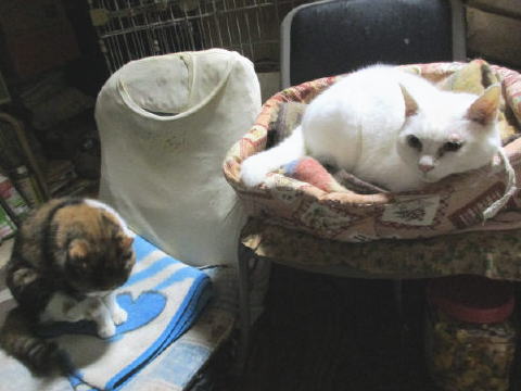 父ちゃんの座椅子上のふみ♀は毛づくろい中 低い椅子上の蘭♀は、こっち見てる
