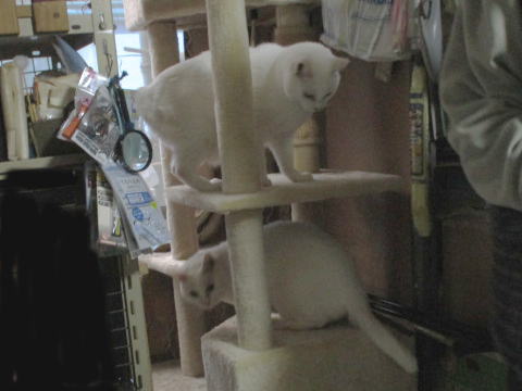 タワーてっぺんのユキ♀が、上からちょっかいを出そうと覗いてる。