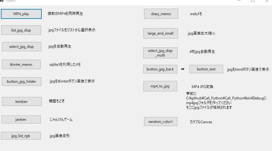 とりあえず自分の作成したpythonプログラムをVC#から呼び出してみました。pythonソースが増えてきたらこれで一括管理すると便利です。MP4_playはpython用のopenCVをインストールする必要があります起動後このようなGUIが出ます。ソースは以下ですクローンして使って下さいVC#からpythonへの呼び出しパスが固定されているのでクローンパスはC:\github\Call_Pythonに展開してくださいgithub2022.03.14:tkinter_memo追加 button_jpg_folde追加 kenban追加2022.03.15:janken追加2022.03.16:jpg画像変形追加2022.03.16:webメモ機能追加2022.03.16:MP4_playにヘルプ追加2022.03.17:jpg画像の拡大縮小追加2022.03.17:4枚jpg画像自動再生追加2022.03.17:jpg画像をhtmlボタンで表示機能追加2022.03.17:MP4動画からjpg作成機能を追加2022.03.18:カラフルCanvas追加2022.03.18:タイマー機能追加2022.03.19:英和辞書機能追加 ejdict.sqlite3のサイト2022.03.19:webメモのhtmlをローカルに置く2022.03.19:button_test.htmlをローカルに置く2022.03.20:webメモの背景変更2022.03.20 button_test.htmlの背景変更2022.03.23 次の画面を追加2022.03.23 スクレイピング追加2022.03.23 スクレイピングURL固定2022.03.24 スクレイピングURLをリストから選択2022.03.24 四則演算機能追加2022.03.24 四則演算機能の計算機の背景追加2022.04.22 テキストファイル読み書き追加2022.05.15 スクレイピングで選択URLでも可能とする2022.05.15 スクレイピングを選択の先頭とする2022.06.06 MP4_playにブラウザ再生を追加する2022.06.09 tkinter_scrapingで結果をブラウザ表示する2022.08.09 diary_memoで単純なweb表示機能追加2022.08.18 web search機能追加2022.09.15 pdf_to_text機能追加2022.09.29 thread_scroll_text機能追加2022.10.03 thread_scroll_textにフォント変更追加2022.10.15 multi_scraping機能追加2022.11.07 トンボーダーゲーム追加2023.04.13 sqlite3へのjpg書き込みと読み出し追加★参考★VC#プロジェクト作成からクローンまでの手順は以下です。VisualStudio2019 にC#とpythonをインストールしておいて下さいVisual Studio 2019を起動します新しいプロジェクトを作成しますWindowsフォームアプリケーションC#を選択し次へを押下作成を押下C#プロジェクトのベースが作成されますGitリポジトリのクローンを実行します。リポジトリはクローンのURLパスを入力しますhttps://github.com/snc29654/Call_PythonパスはC:\github\Call_PythonですCall_Python.slnをダブルクリックソースが展開されますデバッグ無しで開始します。プログラムが開始され以下のGUIが出現します。次へを押下すると後はいずれかのボタン押下でpythonが実行されます。webメモ python pyramid起動と同時に 操作用のwebブラウザが呼び出されます。 スクレイピングも可能です。 たとえばyahoo newsをスクレイピングし WEBページを表示します。【中古】いちばんやさしいGit&GitHubの教本 人気講師が教えるバージョン管理&共有入門 (「いちばんやさしい教本」シリーズ)【中古】 開発ツール徹底攻略 Git/GitHub/Jenkins/Vim/Em / Junio C Hamano, 大塚 弘記, 川口 耕介, kana, 大竹 智也(tomoya), 尾藤 正人, WEB+DB PRE / [大型本]【宅配便出荷】GitHub Actions 実践入門【電子書籍】[ 宮田 淳平 ]