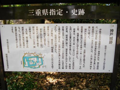 お城へ行こうのコーナー今回は三重県の神戸(かんべ)城跡へ行きました!「こうべ」じゃないよ場所はこちら現地の看板です。クリックすれば大きくなります。天守台の石垣がしっかり残っています。ここに金箔をほどこした五重の天守閣があったのか!かなり立派なものだったんでしょうね!さすがは信長の三男!