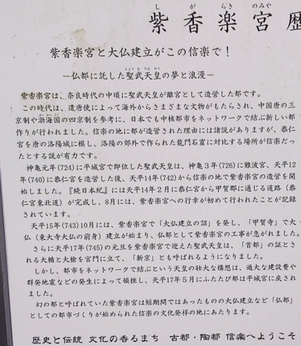歴史の旅に行こうのコーナー・・・と言っても偶然車で通りかかり、短時間で写真を撮りまくったものを羅列するだけですが今回は、滋賀県の信楽です。地元の看板の解説によると、奈良時代にこの地に紫香楽宮(しがらきのみや)という都があったそうだみんな知っていたかい?滋賀県はびわ湖しかないと思っているでしょうが、平城京の時代に短い期間ながら、この信楽に都があったんですよ私は一応知っていましたが、ちゃんとした解説を読んだのは初めてかもしれないなぁ。地元の看板の一部です。興味のある方は拡大して読んでねさて信楽と言えば、やっぱり信楽焼ですよね。たぬきの他に忍者やトラッキーもいました信楽駅前の公衆電話もたぬきです今年から季節によって着る服が変わるそうです。現在は、スノーマン風ですそして中井出古窯跡という室町時代の焼場跡もありました。さて、あともうひとつ紹介したい写真があるのですが、それはまた次の日記にします。お楽しみに?歴史の旅の世界