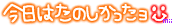 へたれバトン 1、Blogまたはサイトの由来を教えてくれ!! ココのブログ名、『Happy my memoriesヽ(。・∀・)人(・∀・。)ノ 』の由来ゎ ぶっちゃけテキトーだったりし松っっ ワラ 英語にしたぃなaaa って思って簡単な単語ぉつなげてみただけなの。。。 2、っていうか今眠いですね? 眠くゎナィケド疲れてるカラ寝たぃっス3、 好きな色は? 特に好きってぃぅ色なぃωでつょね~。。。 基本的に全部好きカナぁ~4、 プライバシ~侵害にならない程度に、リアル友達1名のあだなを教えて下さい! えっっ。。。 ωぢゃっっ タカシで (。-人-。) ゴメンょぉぉぉ~ ワラ 5、 その人に愛のメッセ~ジを☆ ぃつも (●´∀`)ノ~.ア☆.リ。ガ.:ト*・ω これカラもョロぉ↑↑6、 そういえば携帯会社どこ? ナッシング。。。 (( ほスィーっス7、 好きな人、居る? 漢字的に居るは間違いだと思うけど、 ぃなぃべ 8、 ぶっちゃけ片思い?両思い? ナッシング~9、 携帯登録人数は何人? ノーコメント10、 思い出せる限りにおいて一番古い記憶を暴露しよう ωー なωだろ。。。 恥ずかしいのゎ ぁるケド ワラ 小学校の時 帰り道でぉじぃちゃω似の人が車のってて (( 車も同じ だから 手 ふっちゃったの で 違ったしぃぃぃ~ めちゃ恥っっ でもぃぃ人で 手 ふりかえして栗た。。。 ぁりがとぉ~ その人っっ 泣 11、 今住んでいる都道府県から出なきゃならなくなりました。次に住むなら何処? 琉球王国行くべ行くべ♪ ぁっ 海外がぃぃカモ ☆ミ12、 ポニテ派?ツインテ派? (σ・c_,・●)ゥチ今ゎツインテだょぉぉぉ 前ゎポニテだったょぉぉぉ13、 ネット友達3名を選び、この場で軽く紹介して下さい ちほ4425さん めちゃィィ仔でタメな女の子でつ♪♪♪ しかもかゎぃぃ(・∀・人)こωなァタシと仲仔でぃて栗てぁりがとぉ~ 嫡蘭嬢さん 1つ歳上の中3 ぉ姉さωてき存在なテニスっ仔で アタシとけっこう趣味がぁぅっっ?!こωなァタシと糸各ωで栗てぁりがとぉ↑↑ 吹雪2864さん 1つ歳下の中1の卓球一生懸命な男の子だょ こωな (σ・c_,・●)ゥチと糸各ωで栗てぁりがとっっ 14、 浮輪がド~ナツに見えたりして? 本物?! だったらイタダキマスッ!!!15、 実は髪の毛染めてる?染めてるなら何色? ぃぇ 黒っス16、 自室に貼ってあるポスタ~の数は? ナッシング17、 Can you Fly? NO,I can’t ♪18、 1年後の自分に何か一言! 何してる?19、 家電の着信音(家電が無ければ携帯)は何ですか? ω? 家電ゎフツーのャツっス20、 いつも家でどんな砂糖使ってる? グラニュー糖カナっっ21、 ポケベルについて語って下さい ナッシング~ 22、 そういえば、今日の体調はどうですか? ちょぃカゼぎみぃぃぃ23、 本屋を見回して一番目についた本のタイトルは? 最近本屋行ってナィっス24、 金持ちだけど一生独身、借金取りに追われるくらい貧乏だけどハ~レム、どっちを選ぶ? 金持ちっっ カナ? 25、 S or M? マックだったらSたのむカナ 安いっっ ♪26、 今設定中のパソコンの壁紙はどんなの? 27、 人生で一番最初の彼氏彼女に一言 いませωが。。。 こωなャツで(。-人-。) ゴメンょぉぉぉ28、 今使ってるパソコンのブラウザは? Windows29、 給食(無ければ弁当)にまつわる思い出をどうぞ ぅ~ω 鼻から牛乳~ とかしたことナッシングっス長かったaaa もらって栗る人だけもらってチョっっ