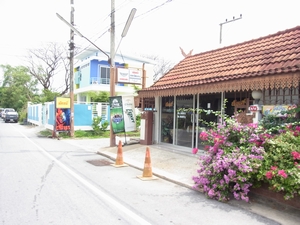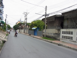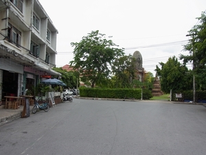 ロッブリー駅の正面を過ぎ、さらに国鉄線路沿いに歩いていくと、またここにやって来ました。ワット・ナコーンコーサー。最初に訪れた遺跡です。背後にプラプラーン・サームヨートも見えてますね。線路上に下り踏切に出たところで、またもや列車が。時刻表に無いから回送列車?それよりも、線路はプラプラーン・サームヨートのこんなに近くを通ってるんですよ。あ、ここの踏切も棒が下りてくるタイプでした。右手のプラカーン廟が真ん中にあるロータリー脇に立ちソンテオを待ちます。ロッブリーで人気のレストランへ向かおうと思いまして。ここから東の方にあり、徒歩では無理なのでソンテオのお世話になろうと。ナーラーイ・マハーラート通りは真っ直ぐだから、ここに来る路線ならどれでも目的地方面へ向かうだろうと読みつつ…。お、来たぞ。エイヤっと乗ってしまいましょう!่時刻は、13:42。ちなみに後で調べたところ、運転席上に掲げられた行き先のドンチャンパー(ดงจำปา)には、バイク用のレース場があるようで。そんなソンテオに揺られてナーラーイ・マハーラート通りを真東に進んでいきます。大学が見えた後、低層のトゥックテオ(長屋ビル)商店街が通りの両側に続いている光景を眺めていると、大きなロータリーに入りました。スリヨータイ・ロータリー(วงเวียนศรีสุริโยทัย)と言うんだとか。ピブーン政権時代の1938年完成。同じくピブーン政権下で完成したバンコクの戦勝記念塔が41年なので、こっちのようがやや古いんですね。17世紀のナーラーイ王治世後、ずっと廃れていたロッブリーの町がピブーン首相がぶち上げた都市計画と陸軍基地設置のお陰で復興したのだろうことが伝わってきます。ちなみに地元民はスリヨータイ・ロータリーというよりも、サケーオ・ロータリー(วงเวียนสระแก้ว)と読ぶことが多いんだそうで。このロータリーの周辺がロッブリーの町の中心部のようです。ロッブリー・バスターミナルもロータリー南西の一角にあることを帰ってから知りました ^_^;)そして川を渡ったところでブザーを押して下車。運賃8バーツを運転手に支払います。時刻は、13:50。この先もトゥックテオ商店街がビッシリ続いてますね~。でも降りた正面は、第13軍管区の基地でした。いい目印になりそう。でももう来ることは無いかな ^_^;)反対側へ渡り、川沿いに出ます。調べたんですがついぞこの川の名前が分からず。どうも運河のようです。そんな川沿いに日陰の多い遊歩道を見つけ、とぼとぼ南へと歩いて行きます。今頃になって晴れ間が出て暑くなってきたので助かりましたよ。頭痛が相変わらず治らない上にバテてきました。あとちょっとだー。こらっ、通れないじゃないか!(笑)でも気持ちいいだろうな~。次の橋のところで左折。住宅街なんですがところどころに商店も見かけるんですよね。表通りからちょっと奥まっているのに意外。結構栄えてるんですね、ロッブリー市街。お、目的地のレストランの看板出現。「マットミー」(มัดหมี่)という名の店なんです。この交差点を右だな…。あら、暑い中ご苦労さまです。バテないように気を付けてくださ~い。…って人のこと言えないか。もうすぐのはず。がんばるぞ。しかしこの後、思わぬ事態に見舞われるのでした…。<旅費交通費>ソンテオ:8バーツここまでの合計:58バーツ※旅は2014年6月19日(木)に行いました。<参考>Wikipedia "จังหวัดลพบุรี"つづく※当ブログから1日旅の記事だけを抜粋し見やすくまとめたブログ『タイ~バンコク周辺バス日帰り旅~』 もぜひご覧ください。そちらのブログは左側の「旅ごとに見る」欄で旅名を選ぶと順を追ってお読みいただけます。旅の参考になれば幸いです。★★★お薦めのタイ語学習書です★★★ ◇ 初 級 ◇ 『あなただけのタイ語家庭教師』国際語学社 ◇ 中 級 ◇ 『中級タイ語総合読本』白水社 ◇ 上 級 ◇ 『タイ語上級講座読解と作文』めこん