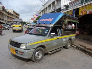晴れてきて日差しのきつくなった路地を歩いていくと、右手に平屋建ての店舗が見えてきました。看板には「マットミー」(มัดหมี่)と。ここだここだ。やっと着いたぞ~。ガラスの引き戸をスーっと開けて覗きこむとお客さん無し。お店やってますか?「まだやってますよ」良かった。冷房の効いた店内に着席。地方のお店にしては小奇麗な内装ですよね。感じの良いお兄さんがメニューを持ってきてくれました。店名の下には「タイ料理(プアン)」と書かれています。プアンって何だろ?帰ってから調べたところ、タイ・プアン族という少数民族のことでした。ラオスの、古代の石壺がごろごろと転がっているシェンクアン高原に元々はいた人達だそうで。かつてはプアン国という王国もあったんだとか。今では散り散りになって様々なところに移り住んでいるそうです。そしてここロッブリーの特産品の一つに、ロッブリー・マットミーというタイ・プアン族による織物があり、店名の由来となっているようで。つまり、そのタイ・プアン族料理の店ってことなんですね。この時は知る由もなく… ^_^;)メニューを見て2品と水を注文。さっきから気になっていたんですが、テーブルにはカノム・トゥアイが置いてあるんですよ。これは無料で自由に食べていいそうです。なんと良心的な店なんだ!お兄ちゃんが水を持ってきてくれたので飲みつつ待っていることに。ん、やたら喉が渇くな。自分でもビックリするぐらいにぐびぐびと冷たい水を飲んでしまいます。そう言えば以前にもこんなことがあったぞ。そうだ。ナコン・ナーヨックの旅から帰って来た時だ。水を勢いよく飲んだ後、寒気がしてトイレで吐いたんだったな。頭痛とダルさでやっとの思いで宿に帰りバタンキューしたんだった。いや~な予感は、的中。寒気がし出しました。いくらエアコンが効いているとはいえ、震えるほど寒いのは、やはり異常です。そこで注文した2品が登場。うぐぅ。食べたいのに食欲が湧かない!頑張って口に運ぶものの、各料理一口で精一杯な状況。美味しいのに。美味しいのに食べられない!!わかったぞ、この症状。熱中症だ _| ̄|○そうか、ナコン・ナーヨックの時も熱中症だったのか。頭の冷静さと裏腹に、体調は急速に悪化。寒気が耐えられないほどに。ちょうど女性グループがやってきて個室に通され、くだんの兄ちゃんも注文聞きで個室に行ったっきりで戻ってきません。うがー、早く来てくれ~。ようやく兄ちゃん登場。ほとんど手を付けていない料理を目の前にバツ悪くお勘定を頼みます。そうだ。最後の力を振り絞り、カノム・トゥアイも一つ味見。くそー、もっと食べたいよーーー。せっかく美味しく作ってくれたのにすみません!心の中で呟いて、ふらふらしながら店を出ます。暑いはずの外気がちょうど良い具合。いや、まだ多少寒気がしています。あ、2品の名前メモるの忘れた。とてもそれどころじゃない -_-;)亡霊のようにヨロヨロちんたら歩いてナーラーイ・マハーラート通りに出ました。ソンテオに乗ると風が寒い!ブルブル震える羽目に。線路を越えたところで下車し、朝到着した時に目ぼしを付けておいたロッ・トゥー乗り場へ直行。チケットを購入して待合室のベンチに崩れ落ちました…。気が付くと時計は15:35。30分ほど爆睡していたようです。お陰で体調が多少回復したような。というか、ロッ・トゥーまだなの?(笑)乗り場に着いたのが15時ぐらいのはず。ようやく15:46に出発です。途中で乗り降りがありながら、最終的にはこんなにガラガラに。そして終点、戦勝記念塔に帰って来れました。時刻は、17:54。呆然とロッ・トゥーを見送ります。でもこの頃には体調がかなり回復してました。今回の失敗の原因は、曇り空だったので安心して水分補給もせずに歩き回ったことでしょうね。多少湿度が高めだったのも影響したかと。ナコン・ナーヨックから帰ってきた時も雨上がりの曇天下、約束に間に合うように走りづめ走ったのがいけなかったのか。不本意な終わり方をしたロッブリーの旅となってしまいました。とくにマットミーの店員さんには、料理にほとんど手を付けなかったことで不快な思いをさせてしまったことでしょう。いつか、お詫びを兼ねてもう一度再訪したいものです。みなさんも、熱中症にはくれぐれもお気を付けを!<旅費交通費>ソンテオ:8バーツロッ・トゥー:120バーツここまでの合計:186バーツ※旅は2014年6月19日(木)に行いました。<参考>"ประวัติศาสตร์เมืองพวน"おわり※当ブログから1日旅の記事だけを抜粋し見やすくまとめたブログ『タイ~バンコク周辺バス日帰り旅~』 もぜひご覧ください。そちらのブログは左側の「旅ごとに見る」欄で旅名を選ぶと順を追ってお読みいただけます。旅の参考になれば幸いです。★★★お薦めのタイ語学習書です★★★ ◇ 初 級 ◇ 『あなただけのタイ語家庭教師』国際語学社 ◇ 中 級 ◇ 『中級タイ語総合読本』白水社 ◇ 上 