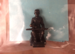 ナレースワン大王がビルマとの象戦勝利を祝って建てた仏塔跡を見終え、白い仏塔を出ると、売店が目の前に。覗くとナレースワン大王の15cmほどの像が目に留まりました。なかなかの出来栄えに値段を尋ねると399バーツとの返事。うむむ。さすが高いな。諦めて、手のひらに収まる極小サイズのナレースワン大王像を頂くことに。59バーツ也。同封の紙には唱えるお経が印刷されていました。さてさて、次の場所へ向かいますか。地図を見ると白い仏塔の裏手にプラタムナック・ソムデット・プラナレースワン・マハーラート(พระตำหนักสมเด็จพระนเรศวรมหาราช)というところがあるんですよね。プラタムナックは高貴な人の住居なので、訳せばナレースワン大王御所ってな感じでしょうか?でもこの一帯では仏塔以外に遺跡は見つからなかったはず。しかも戦場であり、住む場所ではなかったのでは?まぁ、行ってみれば分かりますね。おっと、その前に。水分補給のため屋台でチャーイェン(アイスミルクティー)を購入。折しもまた曇天。ロッブリーで熱中症になった二の舞はゴメンです(笑)10:20、準備万端で歩き始めます。東へ続く一本道を進むこと10分ほどでナレースワン大王御所に到着。こりゃ廟みたいなもののようですね~。こっちは横でした。正面に回ると、ナレースワン大王の兜を模したあずま屋が真ん前に。とりあえず中に入ってみますか。なんだか中国廟っぽい雰囲気ですね。こんなのもありました。中央がナレースワン大王。左は大王の姉。ビルマ王に嫁ぎ、象戦後かの地で殺されたようです。そして右は弟でいつも一緒に戦ったエーカートッサロット。大王没後の次の王でもあるんです。映画『キング・ナレースワン』では、陸軍のイケメン報道官ウィンタイ大佐が演じていて、ひとつの見どころとなっていますよ。ナレースワン大王御所の道をはさんだ反対側には、ワット・ドーンチェーディーが。どうもナレースワン大王御所もこの寺が建てたようです。さあ、また仏塔まで戻りますか。改めて眺めると、意外と巨大ですね。帰りも10分ほどで到着。市を覗いてみます。なぜか洗剤やらシャンプーやらを扱う店が盛況。市価より安いんでしょうかね? ^_^;)左手に目をやると、あっ、土産物売店の屋根も兜だ(笑)ナレースワン大王の兜は、シンボルになってるのか。なんと商品にも、兜を模したキャップが。思わず買おうかと思いましたが、使いみちが思いつかないので思いとどまりました。ナレースワン大王&ドーンチェーディーのご当地ポロシャツも日本で着るにはちょっとなあ ^_^;)まだ11時ちょっと前ですが、お腹が空きました。せっかくドーン・チェーディーまで来たのですから、この地でランチをすることにしましょう!<旅費交通費>歩いただけなので:0バーツここまでの合計:150バーツ※旅は2014年9月18日(木)に行いました。つづく※当ブログから1日旅の記事だけを抜粋し見やすくまとめたブログ『タイ~バンコク周辺バス日帰り旅~』 もぜひご覧ください。そちらのブログは左側の「旅ごとに見る」欄で旅名を選ぶと順を追ってお読みいただけます。旅の参考になれば幸いです。★★★お薦めのタイ語学習書です★★★ ◇ 初 級 ◇ 『あなただけのタイ語家庭教師』国際語学社 ◇ 中 級 ◇ 『中級タイ語総合読本』白水社 ◇ 上 級 ◇ 『タイ語上級講座読解と作文』めこん