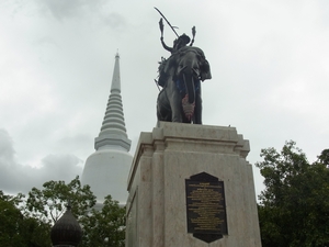 ナーンピム交差点のロッ・トゥー乗り場で発見したドーン・チェーディー行きソンテオに乗り込みます。すると、なんとすぐに発車。時刻は、08:59。乗客は、私を含めて6人。わりと需要のある路線なのかな。スパンブリー中心部の目抜き通り、プラパンワサー通りを北上したソンテオは、左折して国道321号線に入り、ここではスパンブリー川と呼ばれるターチーン川を渡ります。橋を渡った先に、仏塔遺跡を発見。アユタヤ時代かな?中央分離帯の緑地には、バンハーン・ジェムサイ公園との看板が。タワーと同じこの名ですが、バンハーンとはもちろんスパンブリーが地盤のバンハーン元首相。ジェムサイは、その夫人の名なのです。つまり今の日本の首相夫妻に例えるなら、シンゾウ・アキエ・タワー、シンゾウ・アキエ公園ってな感じになるわけでして…。さらに右手の車窓に流れて行った学校の看板を読むとバンハーン・ジェムサイ・ポリテクニック・カレッジと。目立ち凄過ぎです、バンハーン元首相ご夫妻。そして左手には、以前乗車した国鉄スパンブリー線終点マーライメーン駅がとても「ターミナル」とは思えない鄙びた姿で佇んでいました。まさに対照的なのが、今走っているこの国道321号線。走るうちに肥料の刺激臭が鼻を突くようになり、車も滅多に見かけなくなったのに、道路だけは変わらずこの立派さ。「土建王国スパンブリー」をこれでもかとアピールされている気になってきました。乗客がところどころで下車し、最終的には私一人に。データ通信速度が遅過ぎてiPhoneのマップが表示されない中、目的地ドーン・チェーディーを通り過ぎないか、そもそもこの路線で正しかったのか不安になってきます。そうこうしていると右手に柵に囲まれた公園らしきものが見えてきました。あそこがそうなんじゃないか!?信号のある交差点で左折する際、右手に仏塔が見えるではないですか。ここだ!!左折し終えたところでブザーを押し下車。運賃30バーツを支払います。時刻は、09:44。スパンブリーから45分かかったんですね。振り返ると、やはりあそこに間違いない!入口には、 ナレースワン大王記念碑スパンブリー県ドーン・チェーディー郡と。早速入りましょう~。お、市が立ってますね。覗いてみると、観光客向けではなく日用品がほとんど。そんな中でも、焼き物のカップ(?)も売っているジュース屋さんとか、ザクロを1kg120バーツのところにバッテンを書いて100バーツに値下げして売っている店なんかも。最近タイではザクロやザクロ・ジュースの屋台をよく見かけますね。流行ってるのかな?市のテントの列を抜けたところに、いよいよ、ナレースワン大王騎象像と仏塔が。象の首に跨り槍を構えているのが、ナレースワン大王ですね。1592年、この地でアユタヤ軍対ビルマ軍の象戦が繰り広げられました。ナレースワン大王は、なんと自ら敵大将ビルマの王子と一騎打ちに挑み、相手を倒したのです。タイの歴史上、象戦は4回記録がありますが、この時が4回目、最後の象戦となったのだとか。像の正面にもナレースワン大王像が、金箔を貼られた姿で佇んでいました。手を合わせ、奥に聳える仏塔に向かってみましょう。<旅費交通費>ソンテオ:30バーツここまでの合計:150バーツ※旅は2014年9月18日(木)に行いました。<参考>Wikipedia "ยุทธหัตถี"つづく※当ブログから1日旅の記事だけを抜粋し見やすくまとめたブログ『タイ~バンコク周辺バス日帰り旅~』 もぜひご覧ください。そちらのブログは左側の「旅ごとに見る」欄で旅名を選ぶと順を追ってお読みいただけます。旅の参考になれば幸いです。★★★お薦めのタイ語学習書です★★★ ◇ 初 級 ◇ 『あなただけのタイ語家庭教師』国際語学社 ◇ 中 級 ◇ 『中級タイ語総合読本』白水社 ◇ 上 級 ◇ 『タイ語上級講座読解と作文』めこん