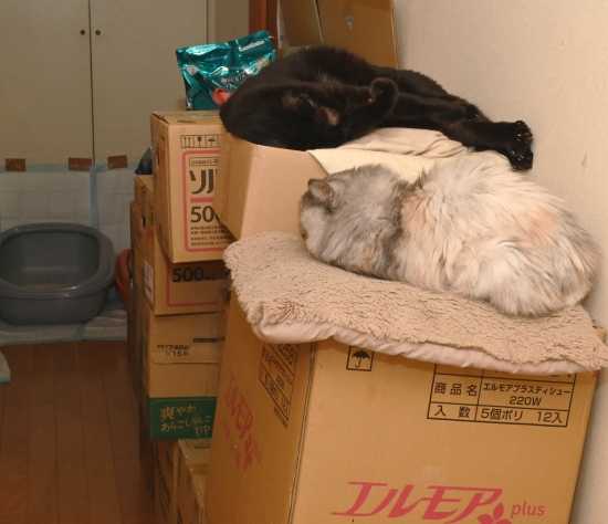 廊下のダンボール箱の上で寝て居るクリとラモ猫砂、ソルラクト(補液パック)、猫ごはん、シリンジなど、猫関連の物品の箱の山震災時に物流ストップする事を想定して、最低でも、一か月半分の備蓄を備えています。箱の山の中に、一つ、猫関連以外も充実野菜(ジュース)は、人間用猫のトイレの砂は、3か月分備蓄しています。まあ、出来れば、ニャンコ達が生きている間は、大震災が来ないのが、一番ですが。ブログランキングに参加しています。このイラストを、ポチっとお願いします。にほんブログ村