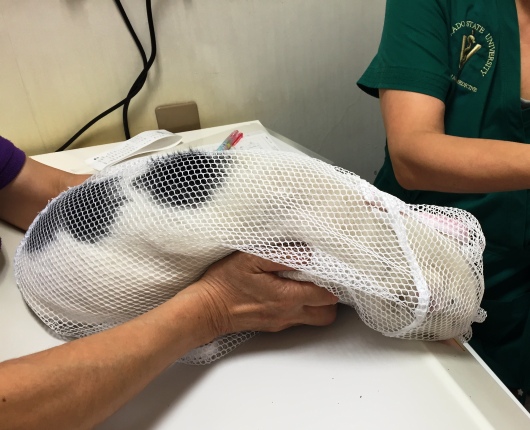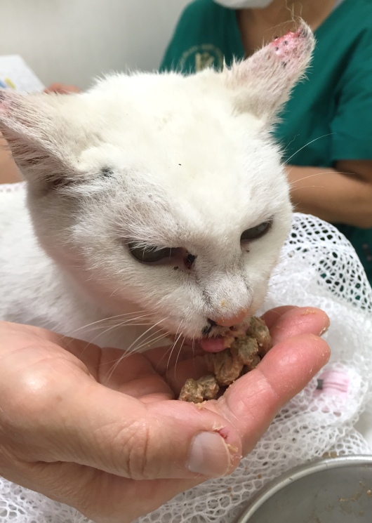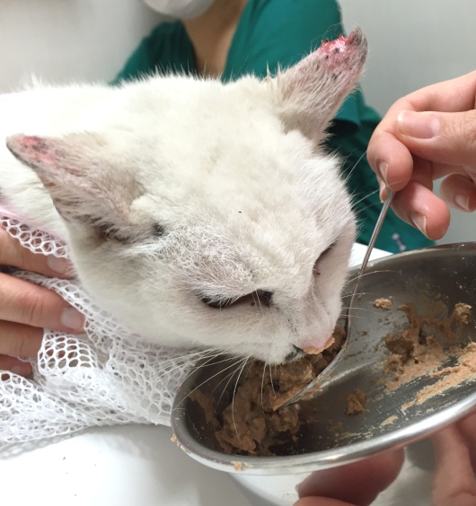 威嚇する事も、逃げようとする事も無く、とても良い子で、お腹が空いていたこともあり、出された栄養食もガツガツ食べています。
