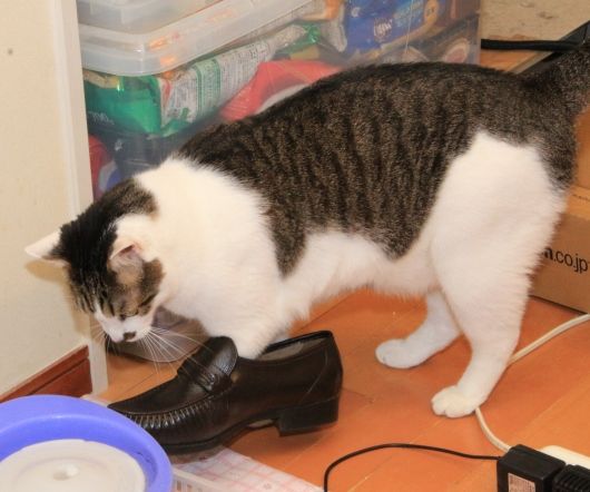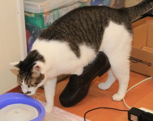 「革靴が閊えて、上手く水が飲めませんニャ。」
