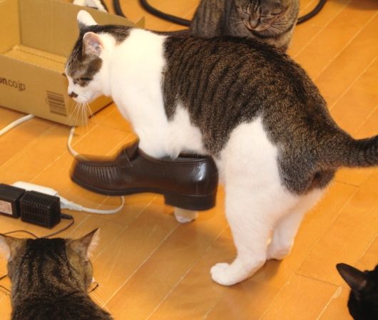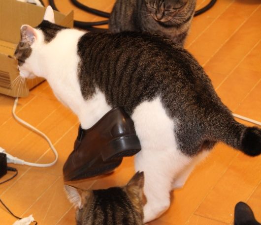 どうも、お父さんの革靴に足を突っ込んで遊んでいたところ、爪が引っ掛かり抜け無くなってしまったようで、そのまま、力技で、歩いてリビングまでやって来たようです。