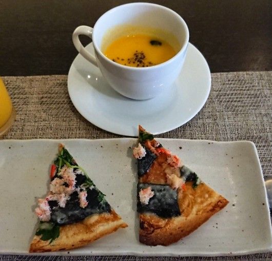前菜2:カニときのこのレンコンきんぴら味噌ピザと、さつまいものスープ