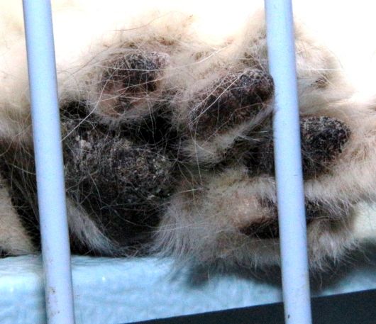 なんと肉球がアスファルト道路のような、ヒビ割れ状態に。
