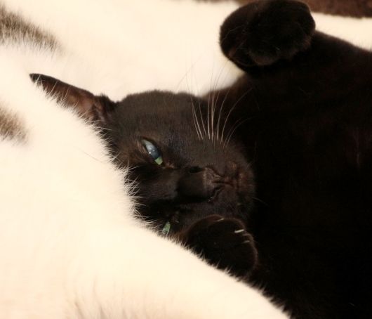 今週から暑くなる予想を受けて、先週末に寝室のエアコンを洗浄し、冷房のスイッチを入れ始めたところ、寝室が涼しくなったので、ベットの上でキラに引っ付くクリ