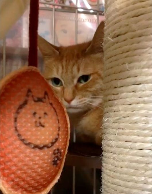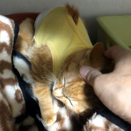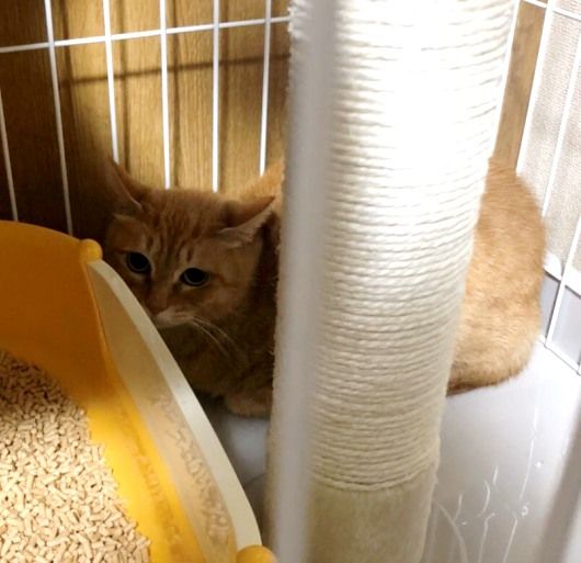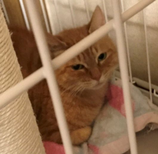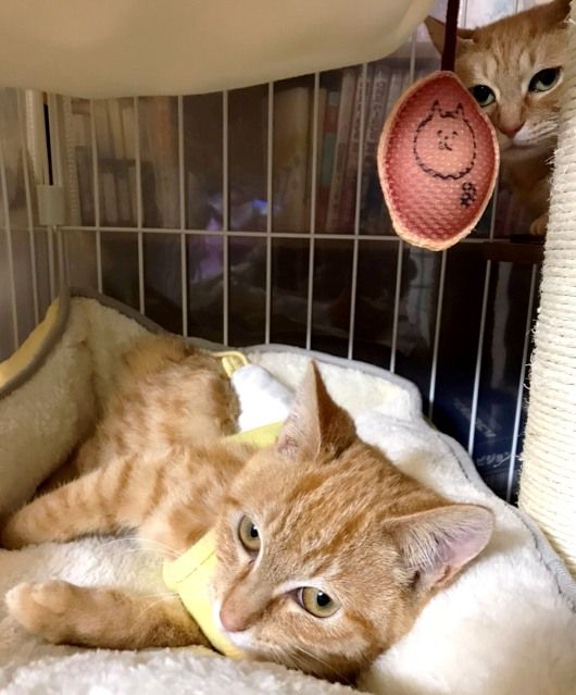 親子で大きなゲージで一緒に暮らしており、術後の娘を心配そうに、母猫がそっと、見守っています。