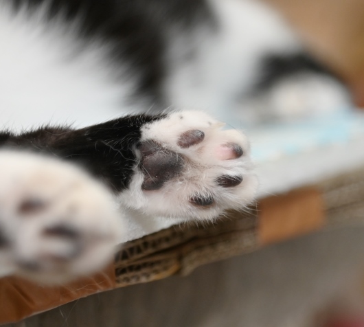白い毛足に黒の肉球のミワ