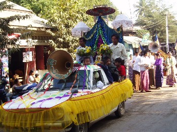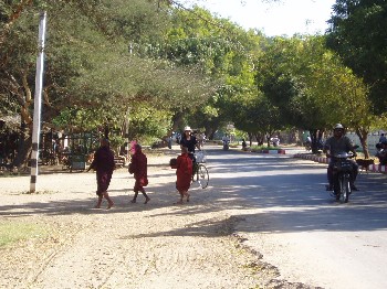 朝、外に出てみると、数種類の楽器の演奏とともに、行列が見えました。宿の日本語が出来るスタッフに聞いてみると、子供が小僧になる儀式を行うらしく、お寺に向かう行列が見えました。 みんな随分と立派な衣装を着ていました。なかなか見ることの出来ない光景が見られてラッキーでした。さて、今日も自転車を借りました。午前中はニャンウーの町の東側に向かい、エーヤワディー川の船着場に行ってみました。ここはマンダレーからのフェリーが着く場所でもあり、乗った人の話では、エクスプレスフェリーは快適で良かったとのことでした。まずは、ボートに乗らないかと客引きに声をかけられました。いらいないよ、というと明日空港まで行くなら俺のサイカー(自転車の横に更に2人分の椅子を付けた乗り物)に乗らないか、と言ってきました。私は、宿でタクシーを頼んだよ(4000チャット)、というと俺のサイカーなら1500チャットでいいよ、と売り込んできました。確かに安いので一瞬心が動きました。でも、よく考えてみると20kgもあるデカいバックパックを積むには、余りにも小さな荷台だし、朝から凸凹道に30分も揺られたくないな、と思い彼のオファーを断りました。彼はしぶとく、3000チャットでタクシー出すよ、と言ってきましたが断りました。たかが10分足らずの道のりで、タクシー代が4000チャットというのは、かなり高過ぎですが、宿の主人がノーマルプライスだよ、と言ったように、後に確認しましたが、空港の看板にも4000チャットと書かれていました。ヤンゴンなら、ダウンタウンから空港より更に先に行ける値段(40分位の距離)ですが、バガンは極端に車が少なく、仕方ないといったところです。彼らから離れた後は、船着場近くの集落を自転車でうろうろしてみました。すると、私に気づいた子供たちや大人までも好奇心を持ったような表情で、こちらを見ていました。中には、ハローと声をかけてくれる人も結構いました。 地下水なのか、単なる溜め水なのか分かりませんが、水を汲んでいました。 若奥さんと子供この家庭に招かれました。おばさんや近所の人が手招きで、どうぞどうぞ、家に上がってて下さいみたいなジェスチャーを笑顔いっぱいでしてくれたので、中に入ってみました。写真は公開しませんが、その家は馬小屋と馬車置き場、小さなテーブルと狭い寝床があるくらいでした。どうぞ座って下さい、と通されたテーブルも、すぐ脇には馬のえさが入ったバケツが置いてありました。馬小屋と家が一緒になったような粗末な家でしたが、そんなことはお構いなしに、招いてくれたことが嬉しかったです。特に何の差し出しものはありませんでしたが、気持ちだけで十分でした。少ししてから彼女たちに別れを告げ、再び自転車でうろうろしてみました。すると、帰宅途中の小学生の集団に遭遇しました。カメラを構えると、あっという間に少年少女に取り囲まれてしまいました。 ハロー!!オヮツ ユア ネーム!?写真撮ってよ、撮ってよ!!見せて見せてー!と大騒ぎになりました。 男の子?女の子?すぐ近くのどこかの国のように、ペン!チョコレート!!ルピー!!何て言わないところがミャンマーっ子の素朴なところです。 一番右の女の子は9才なのに、見事な英語を話していました。将来有望です。ここバガンでは、ヤンゴンよりも人々が素朴で、とてもフレンドリーな感じがしました。観光地化が進んでいるようですが、まだまだ素朴な人々も多いようです。夕方には、ミンガラーゼディパゴダに行ってみました。このパゴダもシュエサンドーパゴダと並んで、パゴダから見える景色が素晴らしい所です。 パゴダを登る階段が壊れかけていて、ちょっと登りづらいものでした。 ミンガラーゼディパゴダからエーヤワディー川を望むサンセットの時間が近づくと、シュエサンドーパゴダに移動しました。ここでは昨日と同じように、綺麗なサンセットを楽しむことが出来ました。相変わらず大勢の観光客がいましたが、日本人個人旅行者は私だけでした。ツアーで来たようなおばちゃんたちは何人か見かけましたが、まだまだミャンマーを訪れる日本人個人旅行者は少ないのでしょうか。今晩も熱々のお湯に浸かって疲れを癒しました。日本食レストラン富士で食べた豚汁定食も美味しかったです。