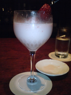 私のオーダーは、「ナイトキャップにクリーミーなものを、甘くてもいいですよ」ということ。確かにおいしい、おいしすぎるのだが、可愛らしすぎるのである。イチゴを使っていたので、向こうに座っている女性のために創っているカクテルとはじめは思っていたのだが、マスターが私のところに持ってきたときは正直あせった。周りの女性のお客様たちからは「かわいい」「きれい」とか言われてたカクテルを運んできた先は「私」なんですよ、これは恥ずかしい。しかもピンにイチゴが3個もついているし。ピンクのイチゴカクテルを飲むおっさんは絵にならなかったですねぇ。あああ、恥ずかしかった。