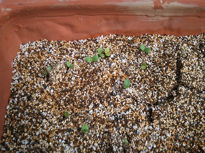 21日に蒔いた山形直送の紅花、発芽しましたかわいいですね。この子はまだ帽子を被っています。