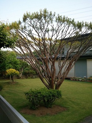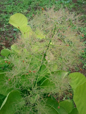 なっつー じゃなかったじわじわと気温が上がっています。「温度計買おうか」と言ったら、次男は「見るとテンション下がるからやめよう」ですって。 こんなときは元気な緑を見て、目だけでも癒しましょう。●スモークツリー 花の先にぽつぽつ赤い種のようなものが枝先は今、こんな感じです。初々しいですね。そして全景はこんな感じです。早く大きくなって日陰を作ってください。