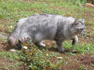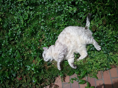 暑いさなかに庭でごろごろ。この子は世界遺産熊野古道の駐車場で、旅行中の兄一家について来てしまった仔猫です。(今はかなりメタボ気味の大人になりましたが) 生まれのせいではないでしょうが、他人には実に愛想のない子。へたに手を出すとかじられます。