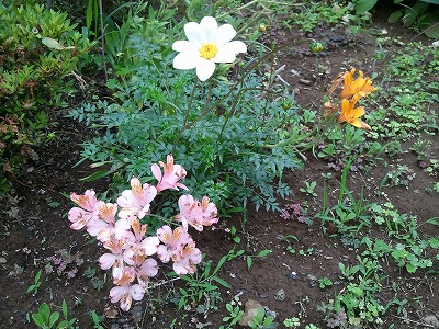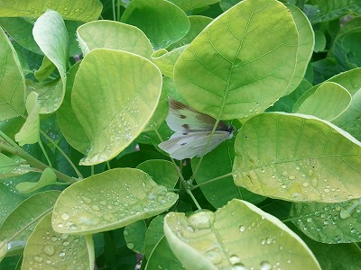 スモークツリーの葉の間で雨宿りするモンシロチョウを見つけました。チョコレートコスモスは、去年も5月頃から、秋が深まるまでずっと咲き続けました。これは今年植えた2株ですが、去年短く刈り込んで忘れていた株も、緑の葉っぱが元気に伸びています。カーペットローズがものすごく元気。ピンクは花が一重です。