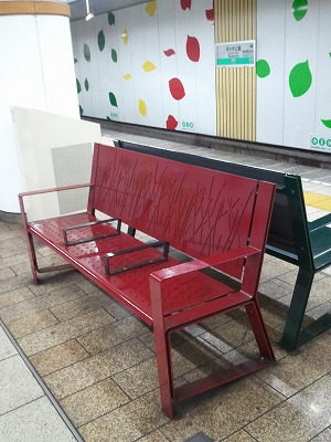 営団地下鉄千代田線(東京)のベンチです。硬そうですが、座り心地はいいんです。色もデザインも好きです。写真は代々木公園駅。隣りの明治神宮駅と違って、夕方5時でも人影はまばら。