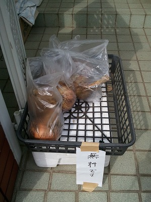 以前、朝の散歩で「無料」の札の付いた箱からひまわりの種をいただいたことがありましたが、今朝は「無料です」と貼り紙された玉ねぎ。一礼していただいてきました。大きいとは思いましたが、ホントに巨大でした。1個で4人分のカレーができそうです。