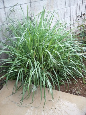 夕方の通り雨に濡れたレモングラス。物干しとブロック塀の間の三角地帯で強く生きています。冬にはチョンチョンに刈り込んでしまうのですが…。「ハーブは野草だもの強いわよ」というのがよくわかります。一度大胆に収穫しようと思います。丈は1メートル超え。カレーにハーブティー、ほかに使い方ありますか?