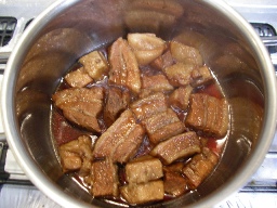 なーんて大層なタイトルですがあまり期待しないでくださいね。 (〃∇〃) てれっ☆そういえば私、自分で作った料理ってほとんど(いや全然)話題にしたことありませんね。強いて言うなら、いくら丼とアサリの酒蒸くらいで料理と呼べないし…(^-^;A実は今回もそんなたいしたものではありません。とっても簡単な料理なのです。その名も豚の角煮です。そういえばここしばらく角煮を作っていませんでした。というのも、私あまり脂肉って得意ではなくて豚バラブロックを買おうとした時脂身が多いと即却下してしまいます。最近は国内産のお肉も少なくて(デパートに行けばあるのでしょうが)なかなか買う機会がなく、もっぱらデパートでできているものを買ったりパックで安く売られているものを買って大根と一緒に煮たりしていたのです。以前作っていたレシピはオイスターソースを入れて煮る作り方でした。それはそれで美味しいのですが、最近私が美味しいな~と思っている味ではなくそういう理由で作らなくもなっていました。馬鹿の一つ覚えで同じレシピでしか作らない私…(^_^;)今の世の中ネットで作り方を検索すればいっぱい出てくるのにそういうところはネットを使わないんですよね~(笑)たまたま先日、生○のカタログで豚バラブロック(カットされたもの)とレシピが載っていたので買ってみました。自分の目で確認していないので脂の量がわからないのがちょっと怖かったのですがなぜか今回は買ってみる気になったのでした。そしてレシピを見ながら作り出したところ。。。えっ?!調味料の量が書いてないよ…( ̄Д ̄;) ガーンはじめにウーロン茶で2時間ほどあくを取りながら煮て(お肉が隠れるほどひたひたな量で)それからざるにあけお水でよく洗います。そしてお水としょうゆ、酒、砂糖で2時間ほど煮る…とこれだけ。(うろ覚えですがそんな感じです)すんごいアバウトじゃないですか…?ヾ(;´▽`A``アセアセまあ、私も料理歴20年以上ですからね~、経験でやっちゃいますけどっξ\(^。^ ))))) オーホッホッホッホッホ~♪できてみたら、そうこの味!私が求めていた味だったのです~。いやぁ~ん、こんなシンプルな味付けでよかったのね!と、調子づいてまた今日も作ってみました。 この作り方だとほとんど脂が取れてしまい、逆にお肉だけ食べるとパサパサしちゃって美味しくないんですよね。脂身と一緒に食べるとgood!しかし500グラムほど買ったのにこんなに量が減っちゃって小さくなってるし…壁┃oT) ウルルルー今度はどーんと1キロくらいで作ってみようかしら。だって4時間も煮てたらガス代バカにならないですもんね♪