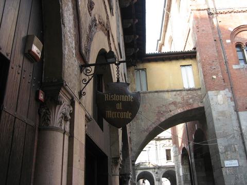 ミラノ、ドゥオモ広場の近くで、こんな看板を発見。Ristorante al Mercante、という名前のレストランです。…通りかかったのは午後だったので、もちろんお店はクローズ状態。でも、なんだか重々しい(?)看板ですよねぇ~。Mercante(メルカンテ)を辞書で調べると、mercante(名・男)とあり、(主に中世の)商人、大商人、貿易商。という訳でした。つまり、看板をそのまま訳すと、「大商人のレストラン」ってこと・・・・?…なんとなく、「商談とか、接待とかするのかな?」って思いましたが、看板がいかついので(?)つい、「フッフッフ。。。、おぬしもなかなかのワルぢゃのう」「イエイエ、貴方サマにはかないません、ぶゎっはっはっは~」なぁんて世界を想像(妄想)してしまいました(笑) ちなみに、レストランが面しているのが、メルカンティ広場。ドゥオモ広場のすぐそばという場所、ミラノでもっともにぎやかな場所の一角にありながら、まるでここだけ切り取ってタイムスリップしたかのような静けさと、中世の情緒が漂う空間です。 13世紀から19世紀にかけて建てられ、改築されてきた旧裁判所や宮殿、大富豪のお屋敷跡が立ち並んでいるんですネ。つまり、あのレストランは広場の名前をとってつけられたものだった、というワケみたいですネわたしったら、時代劇の見すぎです(笑)・・・でも、ああいうのって、日本の時代劇のお約束シーンですが、外国でも似たようなコト、あったのかなぁ~。・・・ありそうだなぁ~(笑)