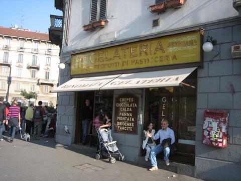 え~、昨日の「船のレストラン」と並んで、ナヴィリオ界隈で有名なのが、このお店。Rinomata、という名前のジェラート屋サンです♪「地球の歩き方」によると、創業はなんと、1920年ということですから、かれこれ100年近く、この場所でジェラートを売り続けているということになります自家製ジェラートということで、スイーツにうるさいイタリア人からも大人気。外で見ていると、観光客もモチロンですが、乳母車の親子、若者たち、そしておじいちゃんたちも次々にお店のなかに入っていくのです☆アンティークな雰囲気のお店は、入るとすぐに、壁一面にぎっしりと並ぶコーンに圧倒されちゃいます♪で、メニューが書いてあるボードがあって、肝心のジェラートはメニューを「読んで」注文するんです。ずらっとならんだウィンドゥをのぞいて「コレ!」って頼むのとはちょっと違って、なんとなくスリルさえ感じます(・・・・。)・・・こういうお店なんだから、ちょっと冒険もすればいいのに、結局いつもの「フルッティ・ディ・ボスコ」を注文してしまう、私なのでした~。 ジェラテリアから、ティチネーゼ門へ向かう通りには、沢山の屋台。・・・ホントに、ありとあらゆるモノが売っています(笑)チープなものから、最高級品までそろっているミラノ。・・・ナルホド、みなさん目が肥えるワケですね~~~