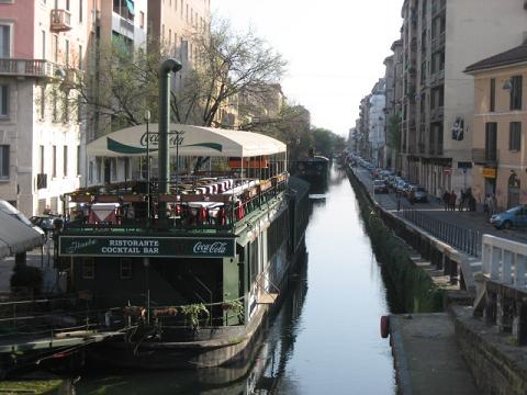 昨日の続き、ナヴィリオから。ティチネーゼ門から南へと伸びる運河は二手に分かれていて、昨日の写真は「ナヴィリオ・グランデ」といって、昔ミラノが水郷だったころの幹線水路だったところです。川幅も大きめで、その昔はドゥオモ建築の大理石などを船で運んだ、といわれているところ。で、今日の写真は、ティチネーゼ門から南へ伸びる通りに平行して流れる比較的小さい水路で、実はコチラのほうが夜の賑わいの舞台となるところです。ガイドブックなどにもたまに載ってますよね、この船のレストラン。もちろん、カタチだけで、絶対に動いたりしないのですが、宵闇にランプの明かりで浮かび上がる船は、ナヴィリオの夜を華やかに彩ります。・・・・ま、真夏は蚊が出そうなので、外から眺めるダケ、っていうのが正解かもね~~
