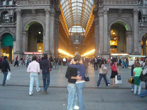 夕暮れの、ガッレリア前にて。・・・別に狙ったワケじゃないんだけど、BACIしてます 日本でも最近は、人前でイチャイチャ、平気になりましたが、やっぱりみょ~に大胆で、かえっていやらしく感じないのはイタリアだからでしょうか(笑)イタリア=アモーレの国。誰が言ったのか分かりませんが、なかなかの名文句だと思いません?アモーレ(AMORE)はモチロン、恋愛だけじゃアリマセン。ある日の朝、トラムに乗っていたら、近くの席に座っていた15-6歳くらいの少女が、突然席を立って、「アモーレ!」って、叫んだんです もう、ホントにキラキラの瞳で、満面の笑顔で。・・・で、彼女の視線の先には、同じ年代の女の子が。きっと一緒にトラムでチェントロに行ってお買い物とかする予定だったんでしょうね。「アモーレ!」と呼ばれた女の子は、「チャーオ!テゾーロ!」と、これまた大きな声で答えて、トラムの中でひしと抱き合う二人。テゾーロ(TESORO)は、「宝物」という意味。女友達同士、「いとしいひと!」「私の大切なひと!」なんて呼び合っているんですこういう呼びかけは、友人同士、家族同士、いつでもドコでもあるのがイタリア。だからこそ、アモーレの国なんです。モチロン、恋人同士がアツアツなのは、普段からこんな風に、愛情を素直に表現できるから、なんでしょうね♪駅で荷物が多くてよろよろしている人が居たら、絶対に手伝ってくれるし、道に迷っていたら、自分がわからなくても分かる人を探してくれる。 年配のご婦人が道路を渡るときには、そばに居る男性が手を差し伸べる。こんな、ちょっとした「アモーレ」が、イタリアの魅力なのかもしれません。ちょっと、「自分は自分、他人のことに首をつっこむなかれ」的な常識が定着しつつある中、こういう場所で、自分の中にどれくらいの「アモーレ」が眠っていたか、思い知るのもいいかもしれませんネ