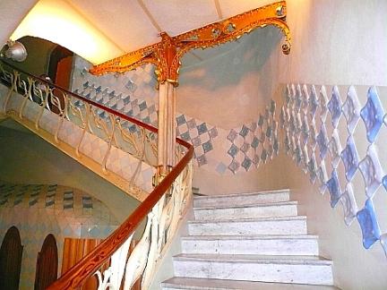 ガウデイー建築 カサ・バトリョ part3 内装2005年にユネスコ世界遺産に登録。建物じたいは1870年に建築、それをガウディーが依頼を受け1904~1906年に改築している。現在はキャンディーで有名なチュッパチャップスの会社所有になっているが、3階以上の賃貸住宅にまだ住んでいる人も残っている。バトリョ邸 内装はセラミック・タイル、モザイク、ステンドグラス、木彫を使ったアート作品のオン・パレードだ。階よってかなり世界が異なる。下はエントランスの階段階段の上からエントランスを見下ろす景色2階に行くとガラッとイメージが変わる。2階はバトリョ家のメイン・サロン大きな窓とステンドグラスだが、丸いガラスは吹きガラスを平たく潰して作ったもの。一つ作るのにも大変な手間が・・。そしして有名な渦巻く天井。ライトは後につけかえられた物とか・・。この部屋の内装のコンセプトは海なのだろうか・・。洞窟か、貝殻の内部のような感じもする。下も有名なマントルピース。内部にベンチがもうけらけている。ちょっとした談話室?ガウディーがこの建物に対して、何をイメージし、表現したかは実際解っていないようだ。(いろいろ説がある。)ガウディーの建築は、フランスのアール・ヌーボーとは違う。それでも分類上どこに近いかと言えばやはり、アール・ヌーボーなのだ。有機的な曲線、明らかに生物や植物をモチーフにしているのが見て取れる。(ドアや窓、螺旋階段(木造の)などはオーソドックスにアール・ヌーボーの様式に間違いない。)ガウディーの作品の比喩で、割と良く出てくるのが「骨」。「龍の骨を表している・・のではないか・・」とかだが、アール・ヌーボー期のアーティストで骨が比喩に使われるのはガウディー以外いないのではないか?少なくともアール・ヌーボーの作者なら何をテーマにしているか一目でわかるものだから・・。本当にガウディーの作品を言葉で表現するのが難しい事を改めて知る。