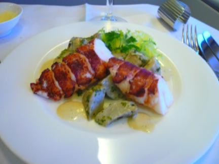 メイン料理(洋食コース)です。ロブスターですね。付け合わせが何かわかりません。芋系? アーティチョーク?下もメインだと思います。幾つかメニューがあり、選べたのかもしれませんが、覚えていません。牛フィレ肉の煮込み、温野菜添え。デミグラスソースで煮込んだ肉でしょう。ホワイトのプレートはどれも一緒です。メーカーを確認していませんが、デザインからすると、ひょっとしたらローゼンタールかもしれません。ドイツの食器メーカーで新進気鋭の作家を集めてモダンな食器を送り出している会社です。作家によってはコレクターズ・アイテムになっている作品もあります。アートな食器で、私もある作家の作品のクリスマス・プレートを少し集めていました。これはシンプル実用向きのリーズナブルタイプであると思いますが・・。飛行機会社によってはカトラリーも気を使っているようです。今までエコノミーやビジネスでは気付きませんでしたが・・。普通に野菜サラダです。野菜がたくさんとれるのは嬉しいですね、おそらくベジタリアンの人とか、ユダヤ教徒の方用の特別な食事は、日本の飛行機会社よりも外国系の航空会社の方が対応が良いでしょう。日本からの便で見かけた事はありませんが、オランダからの便(欧州内)でユダヤ教徒の方が食事をしているのを見たことがあります。私達とは違う箱に入った食事が別に運ばれてきていました。正統なユダヤ教徒の方は、律法を厳格に守ります。だから食事一つに大変な制約が課せられています。ユダヤ教徒の食事(コーシャーミール)は律法(食事規定)に従って調理、祈祷、封印されていなければならないなどきびしい取り決めがあります。肉と乳製品は別々に調理されなくてはいけない。うろこ、またはひれのない魚介類、甲殻類は禁じられている。また肉は、ひづめが割れている反すう動物以外は食べることができない。ひづめが割れているが反すうしない豚は駄目。反すうするがひづめが割れていないうさぎは駄目。それらは禁忌の対象となります。さらに儀式的に屠殺され、準備された動物以外の肉は食べてはいけない。機内食などの加工食品は、ラビの管理下で準備しなければならない。過ぎ越しの祭り(旧約聖書のモーセの出エジプト紀)の時(3月または4月)は、さらに飛行機会社も発酵食品を出さない等の気を使っているようです。※ 厳格なユダヤ教徒はもみあげを縦てロールにしてハットの帽子をかぶっているのですぐにわかりますがオランダやアメリカ国内便の方でまれに見かけるくらいです。まして食事している所をマジマジ見るのは失礼なので・・。リンク ファーストクラスの機内食 1 前菜リンク ファーストクラス機内食 3 日本食