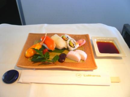 日本食コースです。お寿司ですね。見栄えはすてきですが、味は今ひとつだつたようです。日本から積んだ食品(行き)なのに・・・。帰りのメニューの写真を撮らなかったのですが、帰りの和食の方が美味しかったと言う事です。すき焼きです。よく和食では使われます。味のはずれはありませんが、寿司にすき焼きって日本食のイメージなんですかね。断然洋食の方が当たりでした。これもチョイスで、後もう一品あったのですが、おいしそうに写っていなかったので、はずしました。下はデザートです。これも2品か3品かのチョイスだったかも・・。こっています。カップもチョコで出来ています。下に落ちている石もチョコです。でも全部食べなかった気がします。飾り付けは素敵なんですけどね・・。ムースがこってりで・・。普通にケーキですね。この後デザートのチョコレートも出たような気がしますが、お腹がいっぱいだったので断ったような気がします。フルコース料理が出るので、かなりお腹が一杯になりました。当然食事時間も長くかかります。(エコノミーと違って優雅でゆったり時間がながれてました・・。)問題は食事後もトイレ以外立つ事がないので(さすがに行く所がない。)座りっぱなしなので消化に苦労してました。お酒でもたくさん飲めれば何倍も楽しめたのでしょうが、ワイン一本開けられない(ワイン好きだが弱い)ので非常に残念でした。(一応、航空会社のセレクトした自慢のお酒がいろいろあったのに・・。)座席も快適で、「飛行機の中でこんなに贅沢していいの?」 ちょっと恐縮してしまいました。何しろほぼ水平ベッドみたいにリクライニングするのですがら・・。しかも、前にバックを置く余裕さえありましたから。(皆、結構足下散らかっていました。)正規にお金を払えば(航空会社で異なるが・・)ファーストクラスは、エコノミークラスの10倍近く高いとか??? その価値は人によって異なるでしょうが、その分何回も海外に行きたい人の方が大多数でしょうね・・。もちろん最上のサービスを受けたい人に値段はないのかもしれませんが・・。でも、ビジネスクラスとの差は思った以上に大きかったですよ。因みに、今年乗ったハワイ路線のビジネスクラスはずいぶんレベルが落ちて(座席は少し大きいし多少の余裕はあるけど・・)、エコノミーとあまり変わらなくなっていました。(JAL)そういえばエコノミー症候群と言うのはファーストクラスでもなるのかも。足がむくんでパンパンになり、(帰りの飛行機)ブーツがきつきつで泣きそうでした。最近は機内で着圧ソックスをはくようにしていますが、これ、絶対いいです。むくみに効きますよ。back numberリンク ファーストクラスの機内食 1 前菜リンク ファーストクラスの機内食 2 メイン