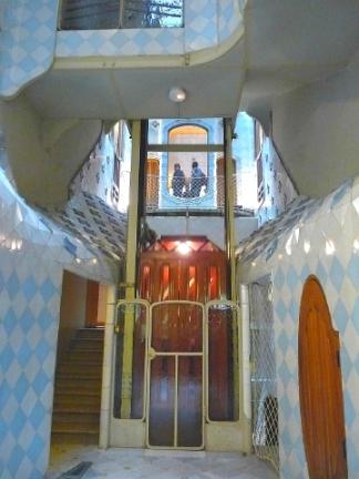 バトリョ邸のエレベーターエレベーターの歴史は以外に古い。滑車式ロープを使って上げ下ろしをした事をエレベーターの起源とするなら古代ローマ時代にさかのぼると言われている。紀元前236年。考案者はかのアルキメデス(BC287~BC212)。動力は人力の手動であった。エレベーターの動力が人力以外のものに変わるのには、それから2000年の時がかかる。ジェームズ・ワットが発明した蒸気機関は1835年、ついにエレベーターの動力として採用され、登場する。蒸気機関が産業革命を起こしたように、エレベーターにも大きな飛躍を与えたのだ。だが、それでも当時のエレベーターは「ロープが切れたり、はずれたり」と、危険きわまりない物でもっぱら貨物用として利用されていたそうだ。1852年エリシャ・オーチスが安全装置を開発。一気に安全性が向上。もう一つの画期的事は、エレベーターの駆動システムに「カウンター・ウエイト方式(つりあいおもり)」が導入。(井戸のつるべと同じ原理)これにより、エレベーターが最上階から飛び出すような事故も減り、高層ビル建築が可能となる。今のエレベーターの元祖と言ったところだ。因みにエリシャ・オーチスは安全装置を売り込み「オーチス・エレベーター・カンパニー」を設立。パリ万博のエッフェル塔、NYの自由の女神、エンパイアステート・ビル、国連ビル、世界貿易センターのツインタワー(テロで崩れた)、霞ヶ関ビルにエレベーターを設置。現在世界最大のエレベーター、エスカレーターの会社である。※こ(1973年にユナイテッド・テクノロジーに買収されたが・・)「エスカレーター」の名はオーチスの登録商標で商品名だったそうだ。下の写真はバルセロナのバトリョ邸のエレベーターであるが、1904~1906年にガウディーが増改築した時のものだ。メーカーまではわからないが・・。よくよく考えたら100年以上前の物? 機械部は取り替えられているんだろうな・・・。そのままだったら怖い!エレベーターは今一階に。上では待つ人たちがいる。エレベーターは二階に上っている所。住人用で、観光客の使用は禁止されているから内部は見えない。これは箱型だと思うが、「両サイドだけエレベーター内部の壁があり、前と後ろは壁なし」と言う恐ろしいエレベーター(寄りかかったら大変な事に・・)が、ヨーロッパでも古いホテルに行くと未だに存在する。安全性を考えると日本では絶対ありえない物だ。でも、こうしてエレベーターの歴史を振り返ると、そう言うエレベーターも「あり」なのかな・・と思う。