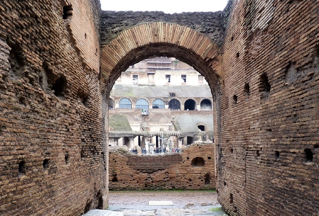 写真を入れ替えて追加しました。古代ローマの円形劇場 3 アレーナ(arena)ローマの円形闘技場(コロッセオ)、アレーナ(arena)アレーナの構造構皇帝のイベントローマの円形闘技場(コロッセオ)、アレーナ(arena)大規模な円形闘技場がローマ帝国の各地にでき始めたのは紀元前後と言われる。現在60あまりが残っているらしいが、ここも当初は劇場と呼ばれていたので、劇場と闘技場の線引きは何なのか? と疑問に思う。周囲を壁でめぐらせた円形のスタディオン(競技場)の事をあえてコロッセオ(Colosseo)と呼ぶのか?※ ラテン語ではコロッセウム(Colosseum)。長径を基準にすると2位らしいが、収容人数規模で言えばここローマがダントツ1位。前回すでに紹介しているが、長径188m短径156m周囲527mの楕円形。高さは48m。座席が45000席、立見が5000席と推定される。グリーンでしめしたのがアレーナの部分。アレーナの下はいわゆる楽屋裏。その上に蓋(ふた)をするように床板が貼られ、さらにその上に砂がまかれていた。一部オレンジで造られている。※ 砂がアレーナ(arena)である。コロッセオ(Colosseo)はローマ帝国時代には浴場についで市民の娯楽の場だった。ここで開催されるイベントを市民は心待ちに観戦して喜んだと言う。しかし、そのイベントはだんだんエスカレートして行く。今考えれば狂気的なイベントばかりが催されたが、市民は熱狂し、なおもそれを楽しんだと言う。このコロッセオ(Colosseo)は。第10代皇帝ティトゥス(在位79年~81年)の治世にまだ未完のままオープンしている。写真上の草でグリーンになっている部分から上に床板が貼られ、フロアと呼ばれる円形のステージがあった。フロアは長径86m、短径54m。フロアの上には流血ですべらないようにアレーナ(arena)と呼ばれる血を吸いやすい「砂」がまかれていた。競技場をアリーナと呼ぶようになった起源です。皇帝のロイヤル・ボックスは南側にあったとされます。恐らくこの写真の右手の中央あたりでしょう。写真中央の門が入場ゲートではないかと思います。アレーナの構造1階席は元老院身分の有力者席で、2階席は騎士身分の者や富裕な市民席。3階以上が貧民の席と決められていたようですが、時代と共に区別は無くなったそうです。1階席手前には厳重な鉄作が作られ、猛獣が飛び越えて来れないような仕掛けもされ、万一の場合の射手も配備。座席の上にはカンヴァス(帆布)の天蓋orテントのようなものが貼られ日除けとされていたらしい。ここではその設備がすでに破壊されて判らないようです。(チュニジアにその設備が残っていたと思うので、判れば紹介します。)死者を運び出す「死の門」があったと言う。下の十字架がそうかな?フロアの下は楽屋裏。今はむき出して迷路のようにさえ見えますが、この中に動物のオリもあり、動物の登場にはエレベーターのような物? or歌舞伎などのせり上がりのようなシステムが備わっていたそうです。模型がありました。因みにコロッセオのすぐ横には剣闘士(グラディアトール)の訓練所? 養成所? があったそうです。皇帝のイベント人気のイベントは、やはり剣闘士(グラディアトール)同士の真剣勝負や、剣闘士vs猛獣の戦いだったようです。その前座もあった。前座の余興には色々盛り込まれ、多くの動物が出演しては殺されたり、今のサーカスのような事も行われていた?こうした余興を自前で提供するのは主に皇帝で、貴族や市民を喜ばせる為に色々な企画を催したようです。動物集めや命がけの剣闘士にお金がかかったが、それが皇帝人気のバロメーターになった。語り継がれるような印象深い、刺激あるイベントを歴代皇帝は競うかのように演出したと言う。このコロッセオのこけら落としは、まだ完成前でしたが皇帝が待ちきれず100日間のイベントを催したと言われている。コロッセオに水を張っての模擬海戦にはコリントから1500人の水夫も呼ばれたとか・・。剣闘士も数多く死んだようです。トラヤヌス帝はダキア勝利の祝賀として、5000組の剣闘士の真剣勝負をやらせたり、動物を11000頭も殺させたそうです。また、演劇刑や猛獣刑があり、罪人、政治犯などを出演させてはその中でショー的に殺しもした。当時の常軌を逸したローマ人の行為に驚くばかりです。キリスト教徒を容認したコンスタンティヌス1世は(272年~337年、在位324年~337年)325年、法令により、人と人の殺し合いを禁じ、動物を殺す悪習も禁じた。と、いいますが・・。皇帝の目をかすめて細々と続いていたらしい。中世期には個人の所有地となり、分割して集合住宅や作業場として貸し出され、地震により崩壊してからは石材掠奪の場となり、法王の住まいや教会にまで転用。1744年キリスト教徒の殉教地を聖地にと言う観点から法王ベネデイクトゥス14世(Benedictus XIV)( 1675年~1758年)(在位:1740~1758年)が勅令を出し保護。現在にいたるようです。次回チュニジアのエルジェムの円形劇場を紹介。昨日と大分内容が変わったような気もします・・。つづくリンク 古