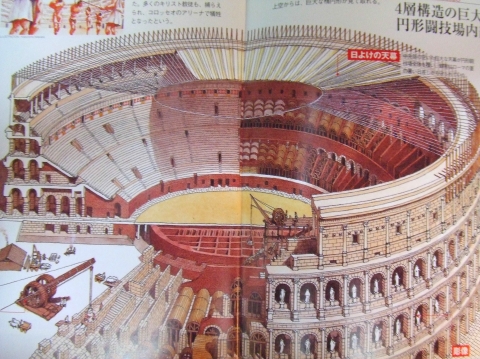 古代ローマの円形劇場 6(天幕)コロッセオの天幕について円形劇場、円形闘技場には日除けの為の天幕が貼られていたようです。もちろん物的なものは何も残っていませんが、フランス、ニームに残る円形劇場にはその形跡が残っていました。下は、天幕の張り方を示した雑誌を見つけたので、資料として使わせてもらいました。天幕は、ドーナツ型で。(中央部は開いていた。)客席の上を覆うように取り付けられていたようです。写真上。屋上の周縁には、天幕をつなぎ留める為の木の柱が無数に立てられ、客席の上をぐるりと覆うように並び、天幕をささえていたようです。生地は、丈夫で厚地のカンヴァス(帆布)が貼られていたようです。下は前に紹介したニームの円形劇場です。ここは、その形跡がほぼ完全に残っている唯一かもしれません。上からの写真がなくて残念ですが、劇場の屋上の縁に飛び出た突起には穴が開いており、木柱を差し込むようになっています。ここは、後世まで集合住宅として使われ、石材掠奪の破壊を免れた為に今もほぼ当時のままに残されています。因みに、この劇場の定員は24000人。二層造り、長径133m、短径101mで、円形劇場としての規模は15位だそうです。しかし、こんなに大規模に天幕が貼られていたとはちょっと驚きでした。やはり古代ローマ人の物に対する発想やその為の技術が、抜きん出ていた事に改めて感心です。もし、このままローマ帝国が滅亡せす、その技術が継承されていたら、人類の文化史は1000年先に進んでいたのかもしれません。そう考えるとローマ帝国の滅亡は惜しかった気もしますが、進みすぎた「文化の後退」も、また、人類史にとって必要な事だったのかも? しれませんが・・。back numberリンク 古代ローマの円形劇場 1 (ギリシャとローマの違い)リンク 古代ローマの円形劇場 2 (ローマのコロッセオと暴君ネロ)リンク 古代ローマの円形劇場 3 アレーナ(arena)リンク 古代ローマの円形劇場 4 (エル・ジェム 1)リンク 古代ローマの円形劇場 5 (エル・ジェム 2 )古代ローマの円形劇場 6(天幕)