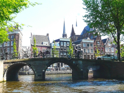 写真をあれこれいじっていたら運河のコースがわからなくなってしまいました。コースはこのさい取りやめて、何となく雰囲気で載せるので、ご了承下さい。アムステルダムの運河 4 キャナルクルーズ 2キャナルクルーズ(Canal Cruise 水上遊覧)ベネチアと異なりアムステルダムは街の規模も全然異なります。商取引を考えた海上交通の発達は、早くから近代的に合理的に完成されたのでしょう。考えてみれば、陸上の動力は、蒸気機関の発明まで待たねばならなかったのですから、街の持つ特性を生かした海上交通は、なんて合理的な物流システムであったのか。しかも現在も通じる大型物資の運搬できる航路は、今見ても革命的なシステムに思えます。下は、旧港のOostrdocとアムステル川を接続するOudeschams運河だと思います。左奥に見える塔はムント塔です。ムント塔は昔、市の城壁の一部の見張り塔でした。1620年の大火で城壁が消失し、塔だけが残っているのだそうです。1627~1629年にこの塔の中でお金(ムントは硬貨の意)を作った事からムント塔と呼ばれるようになったそうです。Oudeschams運河からいったんアムステル川に入り、遡ってから、環状のヘーレン運河(Herengracht)に入り巡って行きます。街の運河は環状と小さな放射状の運河が結びついているで、ヘーレン運河を通りながら見られる幾つも橋や支流へのトンネルを見るのがこのツアーの面白さです。小さく見えて、これでもけっこうな大きさの船が通るのです。橋の縁に着いている電球は、夜になるとライトアップして綺麗です。夜の運河クルーズも絶対お奨めです。橋の密集地です。橋の向こうに橋が見えて、そのまた向こうに橋が見えて・・・、何だか合わせ鏡の中を見ているかのようです。アムステルダムがこんな街だったなんて行くまで知りませんでした。街自体は大きくないですが、本当に楽しめる街です。小さな足こぎボートも楽しそうですね。でも、思う以上に広いので、小さな運河めぐりには良いですが、元の場所に戻れるのでしょうか? 迷路のような運河ですから地元の人なら建物でわかるでしょうが・・。昔からあった橋は丸いですが、近年作られた橋はシンプルでちょっと味気ないですね。でもこのタイプの橋も無数にあります。運河は閑静な中ばかりではありません。ここは賑やかな街中のようです。そのせいか放置自転車が多いようです。近くに何かあるのでしょうか? 橋の上に止めるのはいけませんよね。つづく
