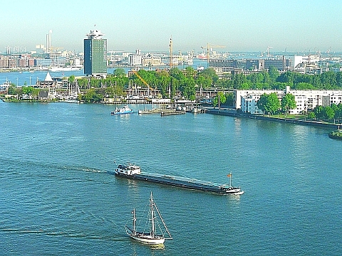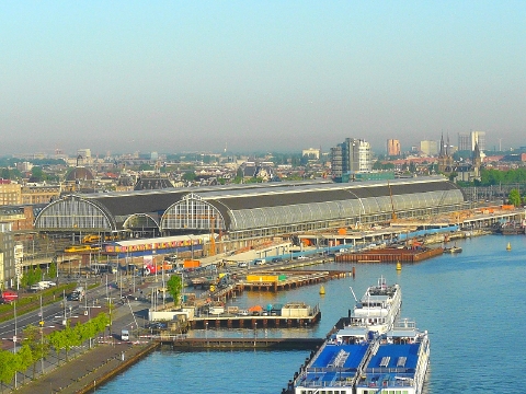 運河に張り巡らされたアムステルダムの街に来たら、やはり運河めぐりのクルーズに乗るのがお勧めです。キャナルクルーズと呼ばれる遊覧船は会社も数社あり、コースも何通りかあり、市内の数箇所の場所から出ています。日中、運河の何箇所かのポイントを回るスタンダードのコースの他、夕刻、ワインとチーズを飲みながらライティングされた橋などイルミネーションを堪能するコースや、ディナーの付いたゆっくりコースもあります。昼と夜は景色もコースも違うので、どちらも楽しめますし、ワインとチーズのコースでは、途中、下船して酒場に寄って一杯飲む体験も付いていました。(会社等で異なります。)クルーズの他にも、水上バスや水上タクシーなどもあり、ホテルの場所によっては水上交通のみで移動も可能です。街中の印象は薄いのですが、運河の印象は強烈に残っています。.アムステルダムの運河 3 キャナルクルーズ 1アムステルダム キャナルクルーズ(Canal Cruise 水上遊覧).日中のスタンダードコースは、たいていアムステルダム中央駅から出発します。アムステルダム中央駅を出ると、北海運河(写真上部)に出てから中央駅裏手を回り、海洋博物館と前回紹介したアムステルダム号前を立ち寄って、No4の東港(17世紀の海軍ドック)から市内の運河に入っていきます。アムステルダム中央駅前の乗船場です。前の建物がアムステルダム中央駅の表側。(裏側は、温室のような半円筒形ドーム)各社乱立してます。b\rコースが同じでも値段は、各社異なるようです。昨今キャナルクルーズの船が多くなっているといいます。それだけ需要があるのでしょうね。下、船は国鉄の線路の橋げたをこぐります。いわゆるガード下ですね。地味ですか、変わっているので乗せました。これから橋をたくさんこぐるツアーが始まります。一見どこにでもあるような線路下のガードですが、船がこぐると考えると不思議な気がします。よく見ると、水面とほぼ同じ高さを車と人が往来していますし・・。ガードをこぐって北海運河方面に出ますが、初回に上からの写真を紹介しているので、アイ湾(アムステルダム港)は、はしょります。キャナルクルーズはやっと運河に突入です。この船は、椅子が固定されていなくて、ざっくばらんな雰囲気ですね。下は、旧港から入った運河にあるNo5のモンテルバーンの塔です。元は、16世紀に建てられた城の見張り台だったそうです。今は時計台が乗っていますが、当初は砲台が乗っていたそうです。船が真下を通過するので見上げる感じです。しばらくすると支流に入るので、運河はどんどん狭くなりますが、それでもベネチアに比べればかなり広いです。小船しか通行できないような路地はありません。つづく