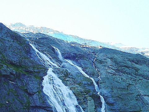 ブリクスダール氷河の氷舌端まで行くのに馬車orカートで30分さらに歩いて15分と言う話は初回にしたと思いますが、その行程の途中で見た氷河も少し紹介してブリクスダールの氷河は終わりたいと思います。ブリクスダール氷河(Briksdal Sbreen) Part 4下は、山頂の氷河が溶けて流れてでた滝です。おそらく元はブリクスダール氷河の母とも言うべきヨステダール氷河(Jostedal Sbreen)を源流にしているのでしょう。モレーン(moraine)・・・堆石、氷堆石氷河が谷を削りながら時間をかけて流れる時、氷河が地面を浸食して生成した岩屑(がんせつ)が土手のように運搬堆積してできた地形で、地形学上の定義では土手状の地形を指すのだそうです。(構成成分は、土,砂,礫 (れき),岩塊)端堆石・・・・・・・氷河末端に平面状か三日月状に堆積。中央堆石・・・・・2氷河の合流部で氷河の中央部に堆積。側堆石・・・・・・・氷食谷の側壁に細長く堆積。エンドモレーン・・フィヨルドの入り口で壁の役目を果たし、フィヨルド内の波をなくす物。山の斜面に張り付いた氷河が(写真上部)少しずつ溶けて氷河湖に落ち、氷河の中の土,砂,礫が崖下に堆積した、これもモレーン(写真下部)のようです。上部氷河は、蘇生<昇華 氷河が溶け出して後退しているパターンですね。山の上の氷河から溶け出して水があちこちから流れて沢を幾つも作っています。馬車に乗り換える駐車場から撮影。氷河期末期は今より温度が5~7℃も低く雪線は1000m近くに下がっていたそうです。つまり、氷河期には全陸地面積の30%が氷河によって覆われていた事になり、現在は10%にまで縮小されているのだそうです。(そのうちの98%が南極やグリークランドの大陸氷河だそうです。)最後にブリクスダール氷河のとっておき写真を紹介。ひんやりする光景です。おわり。